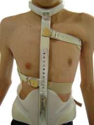 Base e colar fabricados em polipropileno, hastes em alumínio com regulagens, almofadas corretivas acolchoada e fechos em velcro.